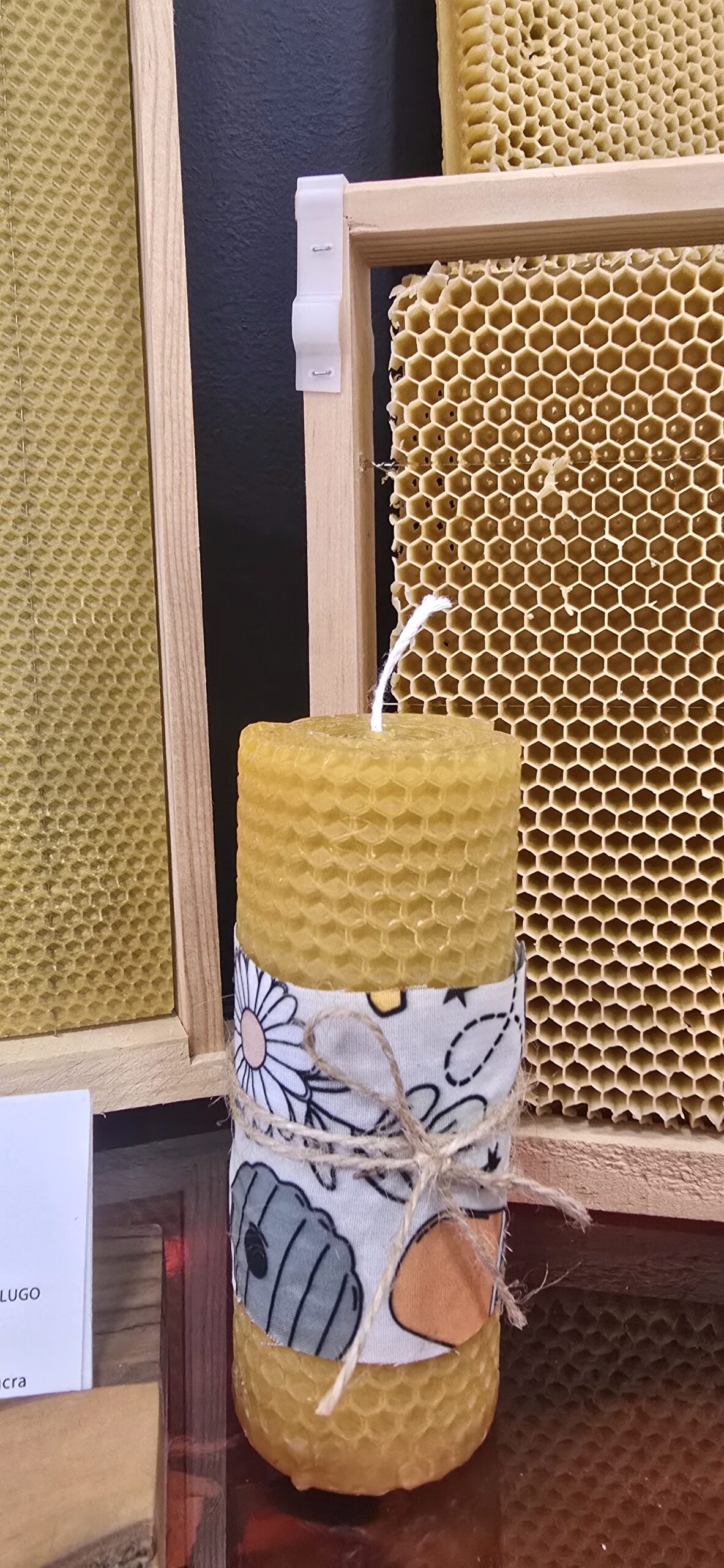Vela enrollada a mano a partir de lámina natural de cera de abeja.
