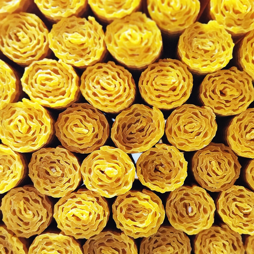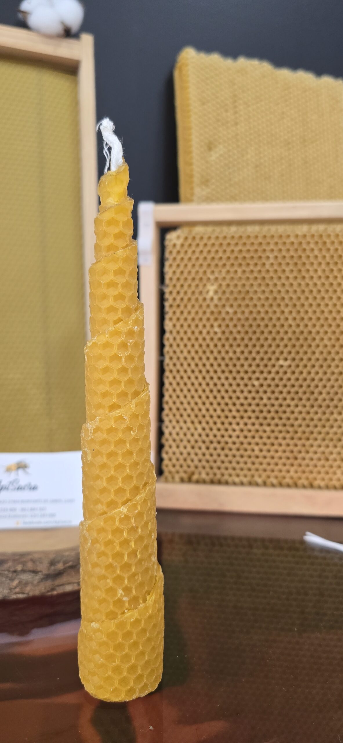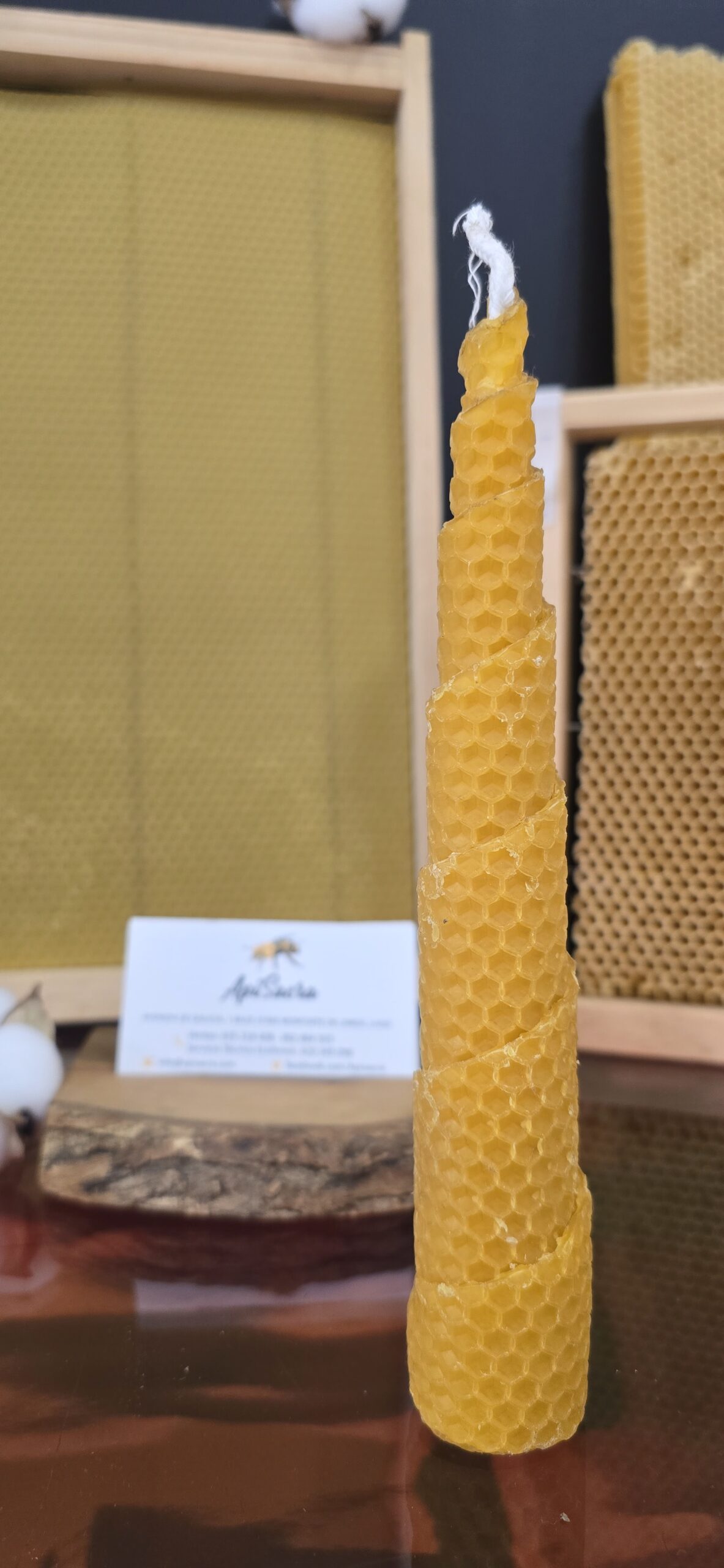 Vela enrollada a mano a partir de lámina natural de cera de abeja.